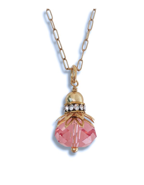 This hypoallergenic necklace features a Rose Pink Premium Austrian crystal with 24 carat gold plating.