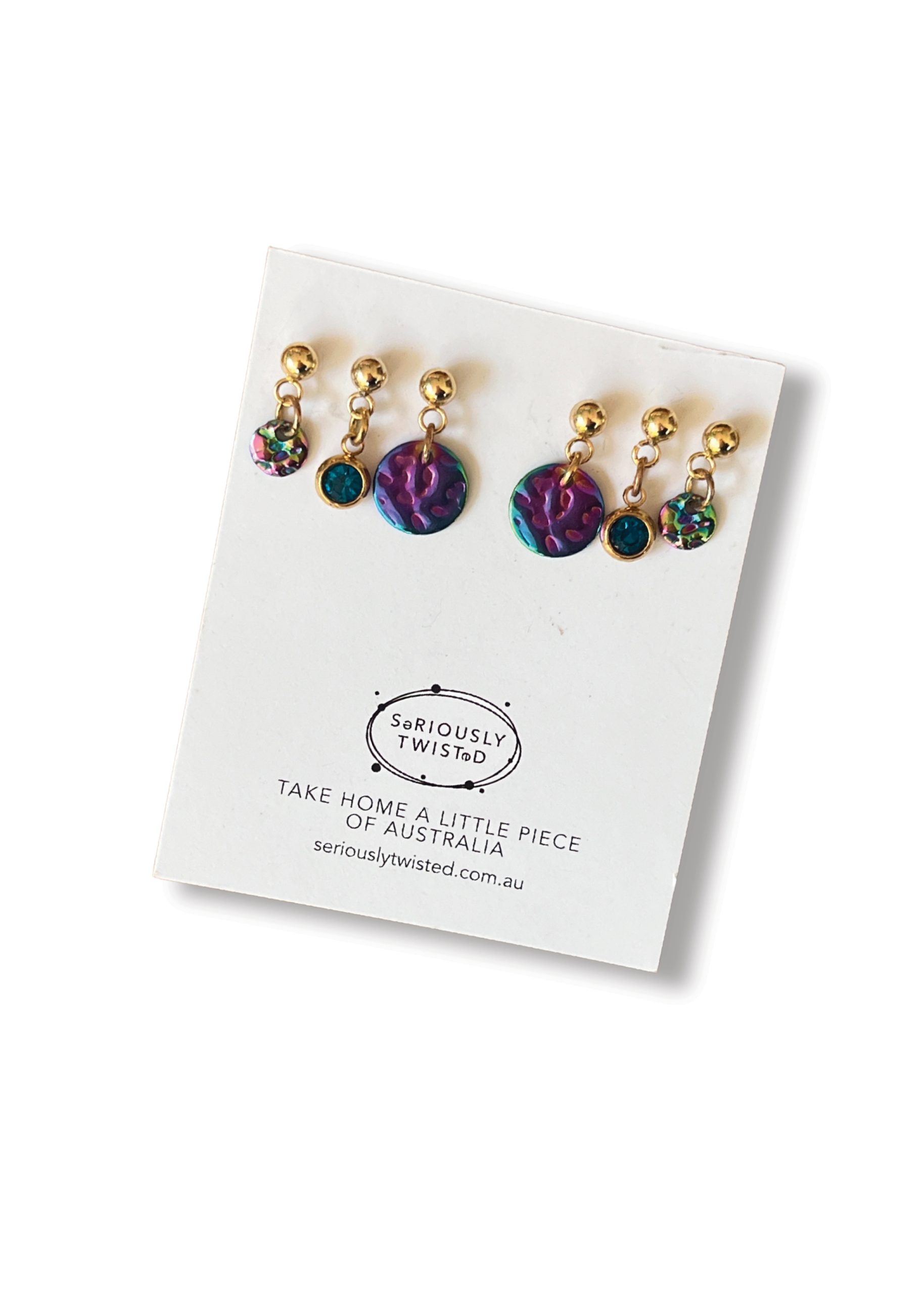 Delicately crafted from durable stainless steel, two earring sets are electroplated in radiant rainbow hues, reflecting every flicker of light with an ethereal glow. The third set has a petite teal coloured crystal to add a bit of sparkle.